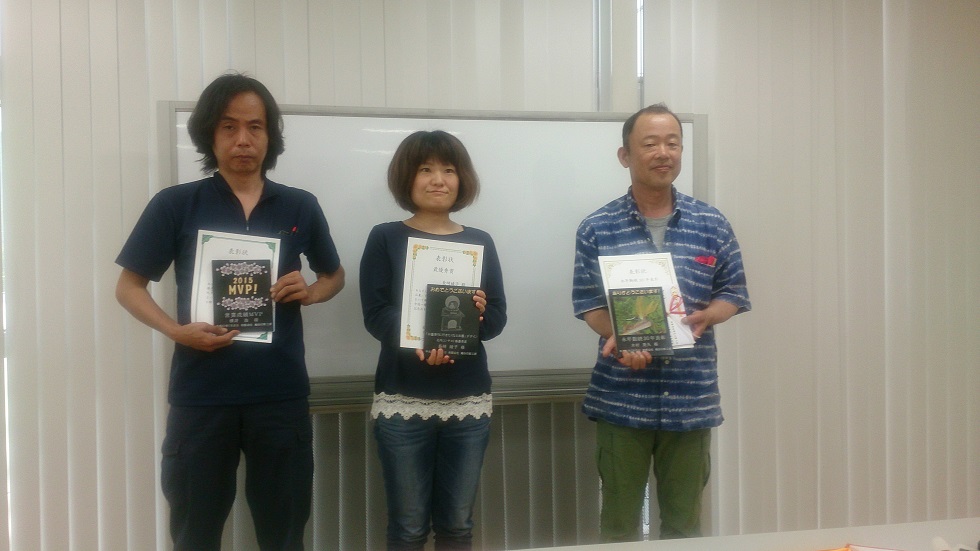 左:営業成績MVP受賞者 中央:社内デザインコンテスト最優秀賞受賞者 右:永年勤続30年表彰受賞者