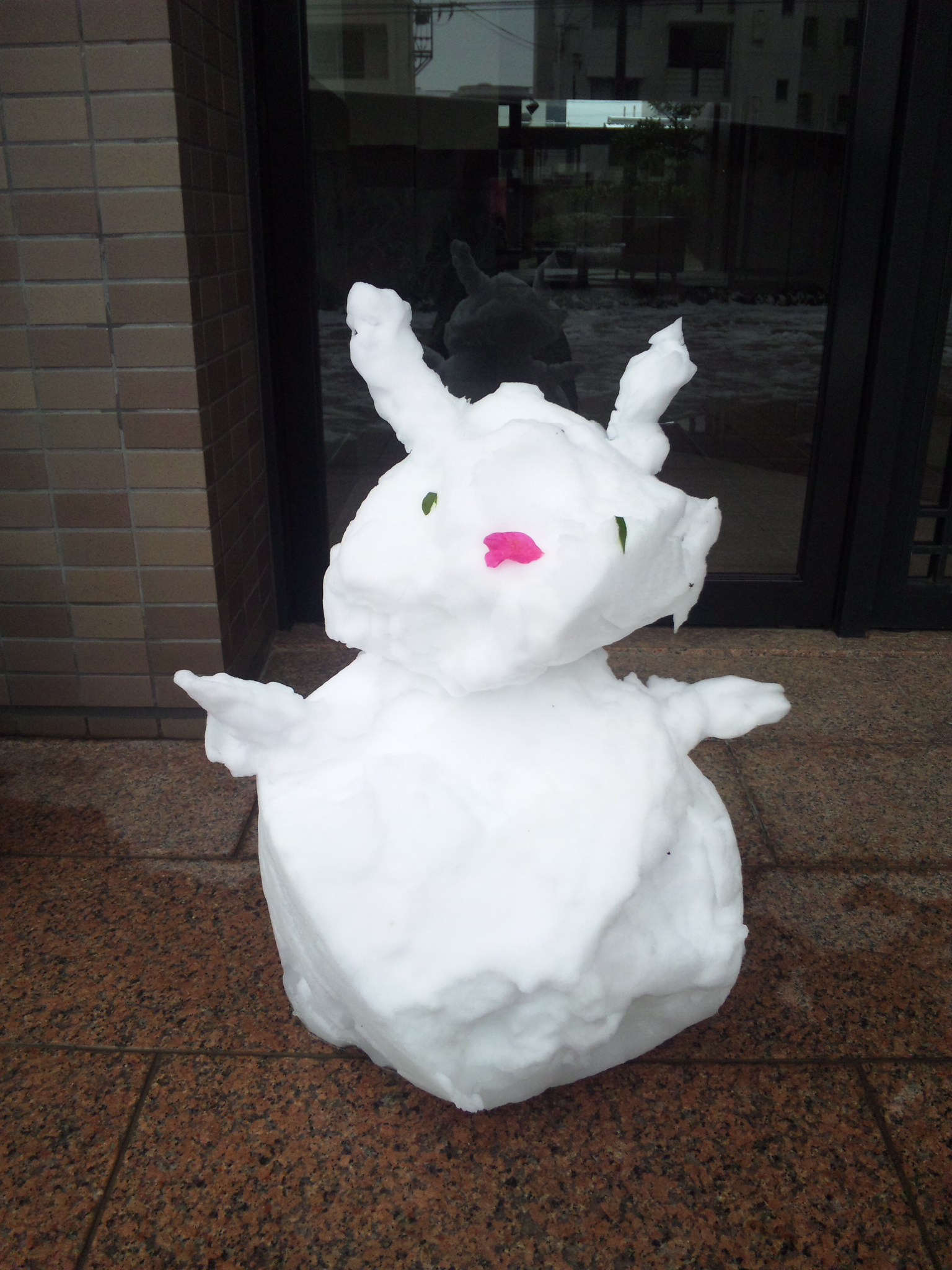 出かけたときにマンションの入り口で雪だるま を見つけました。 とてもかわいかったので思わずパチリ。