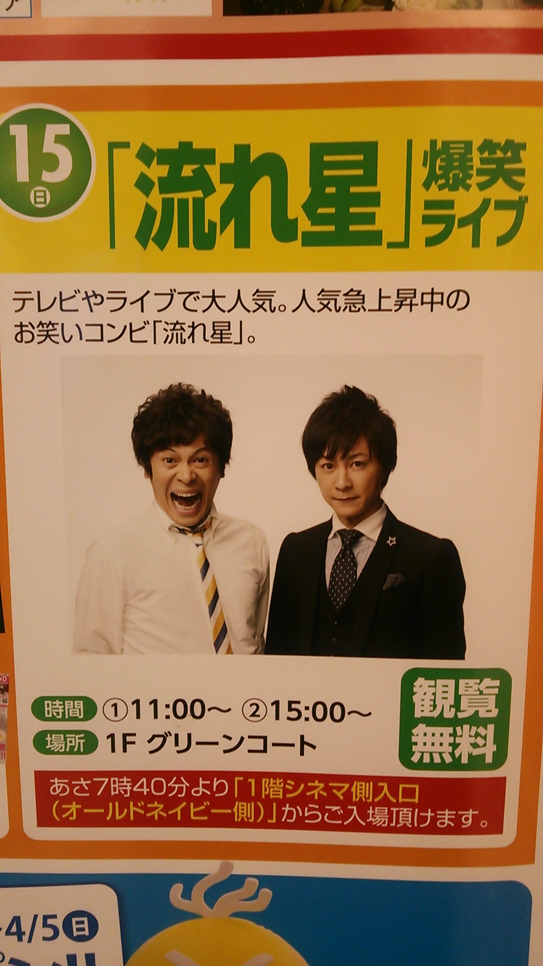 皆さん、お笑いコンビの「流れ星」を知っていますか? 漫才コンビです。テレビにも時々出ています。 先日イオン綾川で無料ライブがあり、行ってきました。