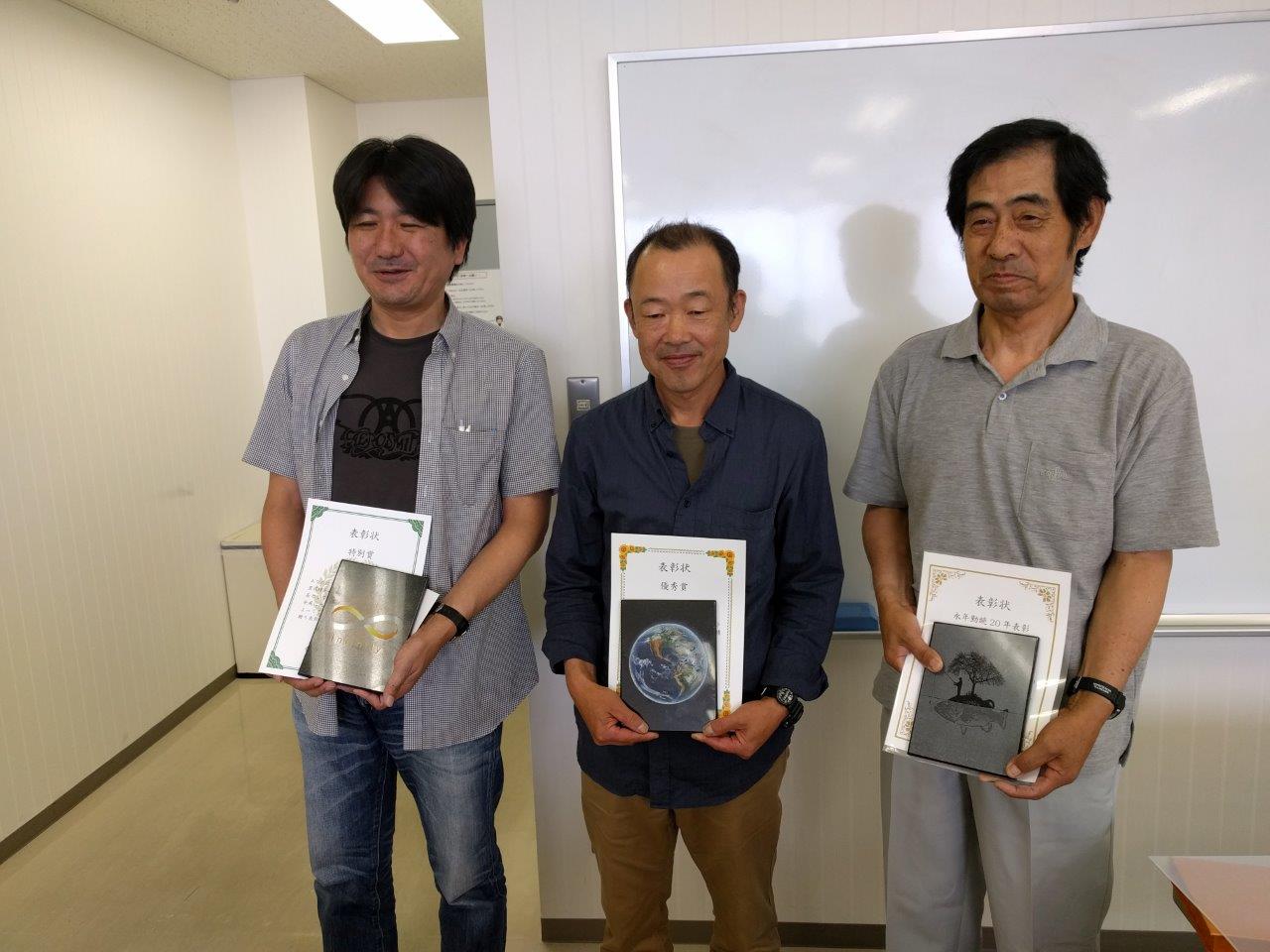 表彰も行われました。 左から特別賞の甲佐所長、MVPの木村工場長、永年勤続20年の太田さん。 今年の盾はデザインがとても素敵でした。